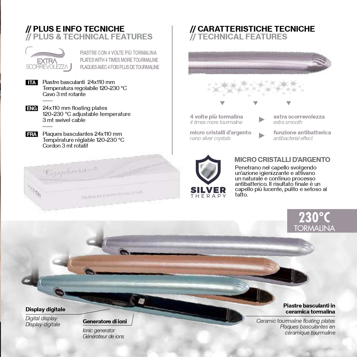 Piastra professionale con placche extra lunghe da 11 cm ancora più scorrevoli grazie alla nuova formula arricchita con una percentuale 4 volte superiore di tormalina e microcristalli d'argento, per un naturale e continuo processo antibatterico. Fusto arrotondato per un facile curling e temperatura regolabile fino a 230°C, ideale per dare forma a ricci morbidi ed idratati o definire il liscio perfetto. Funzione di spegnimento automatico dopo 60 min di non utilizzo.